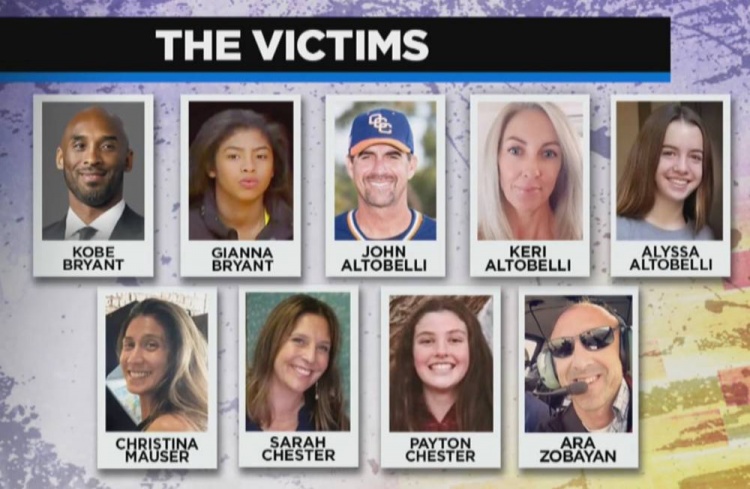 2020年1月26日的直升机事故中9位遇难者分别是:科比、吉安娜,前布鲁斯特白帽队主帅约翰-阿尔托贝利(John Altobelli)与其妻子Kerith、女儿Alyssa,私立小学女子篮球教练Christina Mauser,飞行员Ara Zobayan,吉安娜的队友佩顿-切斯特(13岁),以及佩顿-切斯特的母亲萨拉-切斯特。